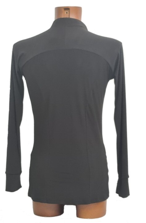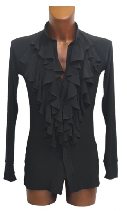 Rich front frills are the signature of this trendy Latin shirt. The buttons can be left open for a sexy look or done up for more conservative look. Made of stretchy jersey, it will never pull out of your trousers, as it is built on shorts.Available in all colours shown on the sampler, can also be custom made to your measurements.