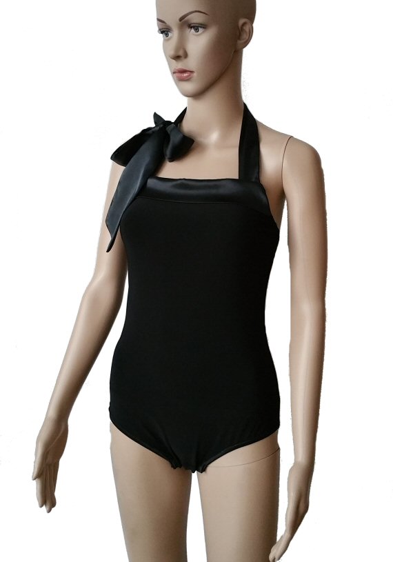 You can wear this lovely halterneck body in a number of different ways depending on how you tie the satin tie around your neck: Plain, With a bow or Cross in front.Made in stretch crepe with a row of 4 push-ins in crotch to keep the body in place.