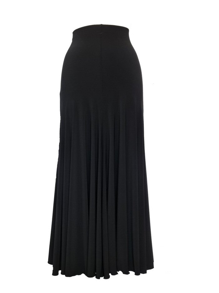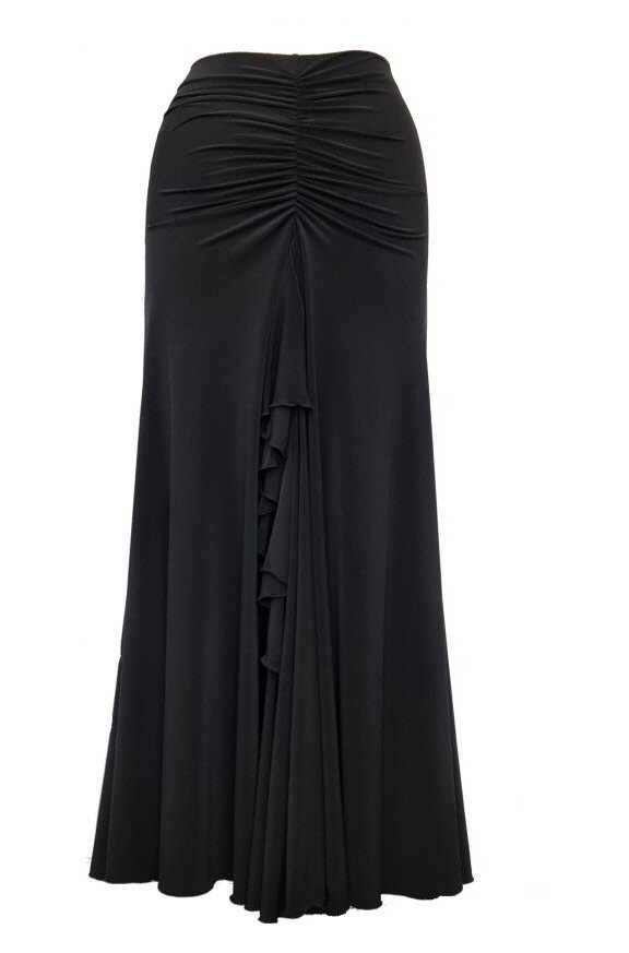 Plain front and interesting back with ruching and flowy, long frill. This skirt is Black, Length 38" ( 96cm) , size 12 for waist 29" - 31"Delivery times: up to 1 week depending on destination