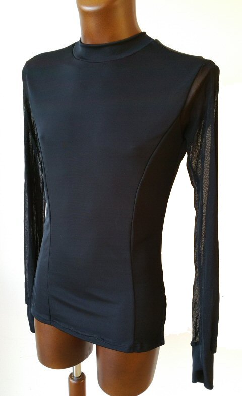 Soft, very stretchy crepe shirt with mesh sleeves. Flat front with no buttons. This is a shirt only, with no underpants.