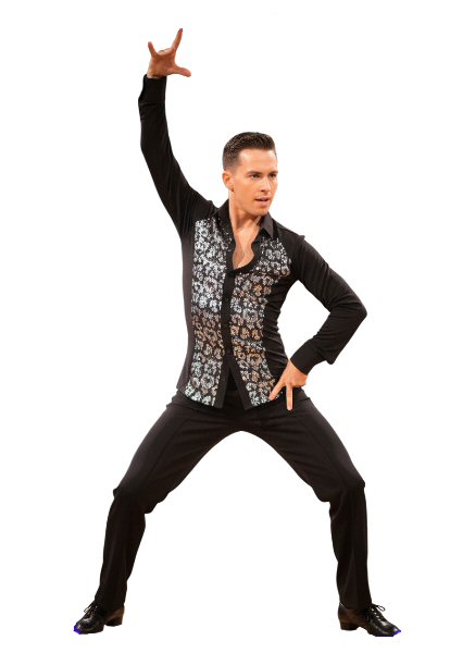 Sequin front panels Raglan cut Latin shirt which can be worn outside your trousers. Single cuff with button. Available in all sizes and can be made in custom size. Black / Grey sequinOne off special offer: Collar 15.5" , chest 38" . Will stretch up to 40" easily.