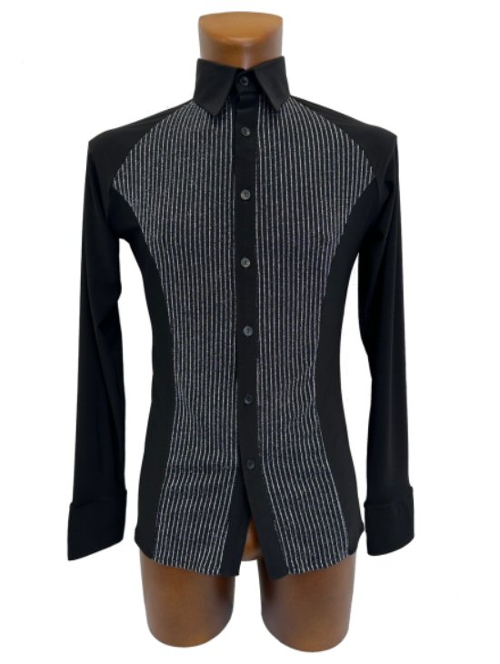 Sparkle pinstripe front, plain back. Raglan cut, stretch shirt. Single cuff with button. Black with Silver Sparkle Pinstripe. Collar 16", Chest 40" One off special offerDelivery times: up to 1 week depending on destination