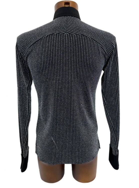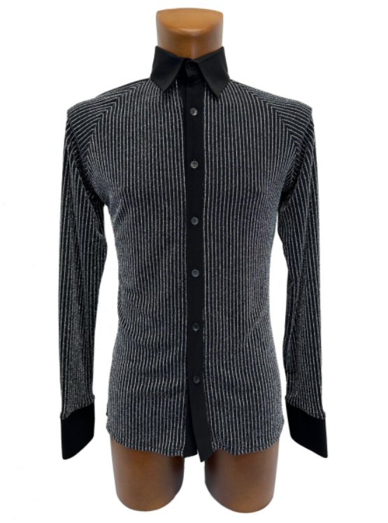 Silver pinstripe Raglan Latin shirt . Single cuff with button. Black The fabric is very stretchy, body friendly and easy care: Dries quickly and does not require ironing. One off special offer Collar 16" , Chest 38-42"Delivery times: up to 1 week depending on destination